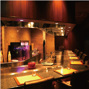 お食事いただけます。ライトダウンされた照明・J字型の特注した鉄板・