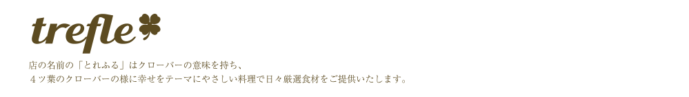 店の名前の「とれふる」はクローバーの意味を持ち、4ツ葉のクローバーの様に幸せをテーマにやさしい料理で日々厳選食材を提供しています。一皿に付いてくる野菜の種類とボリューム、ヘルシーさには自信があります。